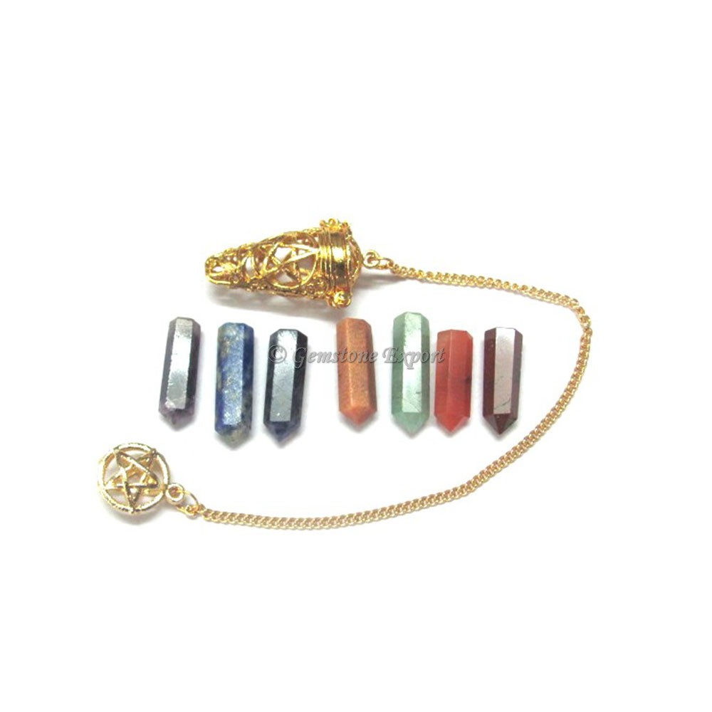 This entire set is artistically designed by Gemstone export. The pendulum is in beautiful golden color accompanied with different gemstones. You can change them as per the need.